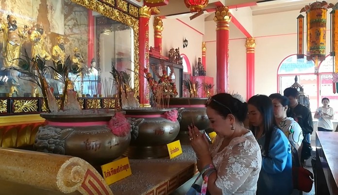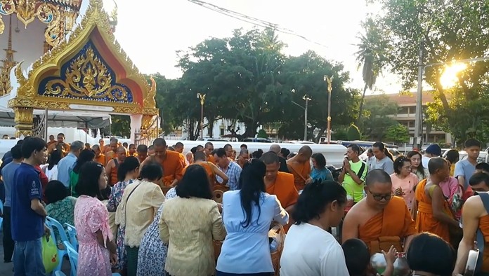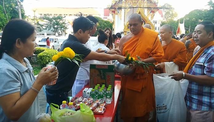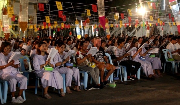 At Chaimongkol Temple, Thais and foreigners alike offered alms of rice and dried food to 50 monks in the morning and attended an evening candle, incense and prayer ceremony led by Chonburi Deputy Gov. Pol Damrongtham.