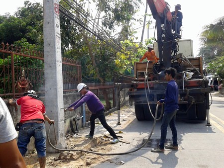 Electrician Chalee Kedeim led a team of 10 PEA workers to the South Pattaya street Feb. 19 to install new high-voltage lines and replace utility poles that were too short or didn’t meet current standards.