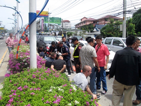 Police blockaded a section of North Road near Sukhumvit Road and managed to corral two Honda sedans, then negotiated with the alleged kidnappers for half an hour before rescuing a beaten and sedated Janek Keersalu (near pole).