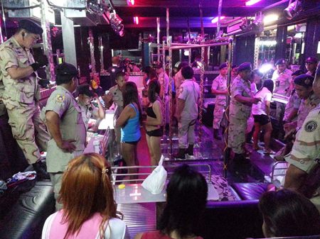 Banglamung Stability Department Assistant Director Prapan Pratumchompoo and 40 officers and hit the Ginza 1 and Ginza 2 bars June 14 after being tipped off to under-18 workers employed there. Four were found and 14 staffers also tested positive for drug use.