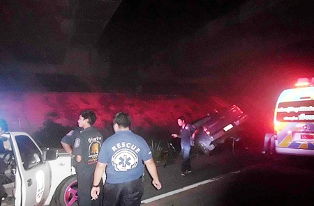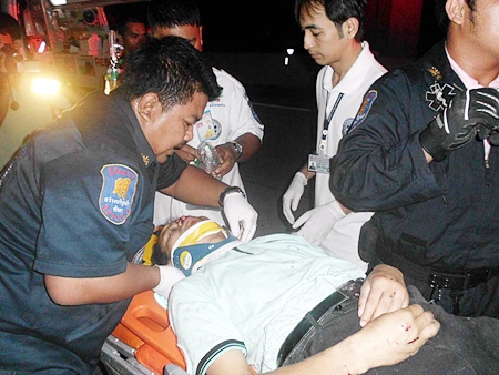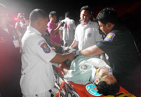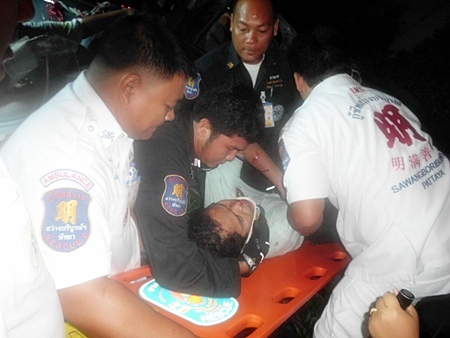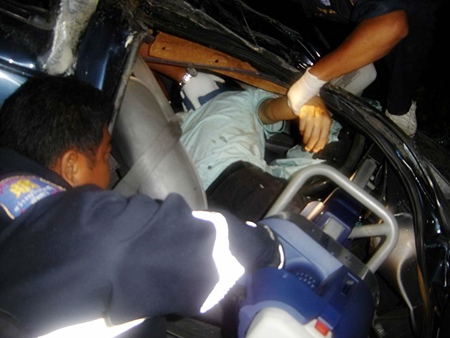 Sawang Boriboon Foundation rescuers used the Jaws of Life to free 33-year-old Bunyiem Phookhaengmok, who was unconscious and stuck behind the wheel of his Ford XLT Aug. 19. He was transported to Banglamung Hospital for treatment.