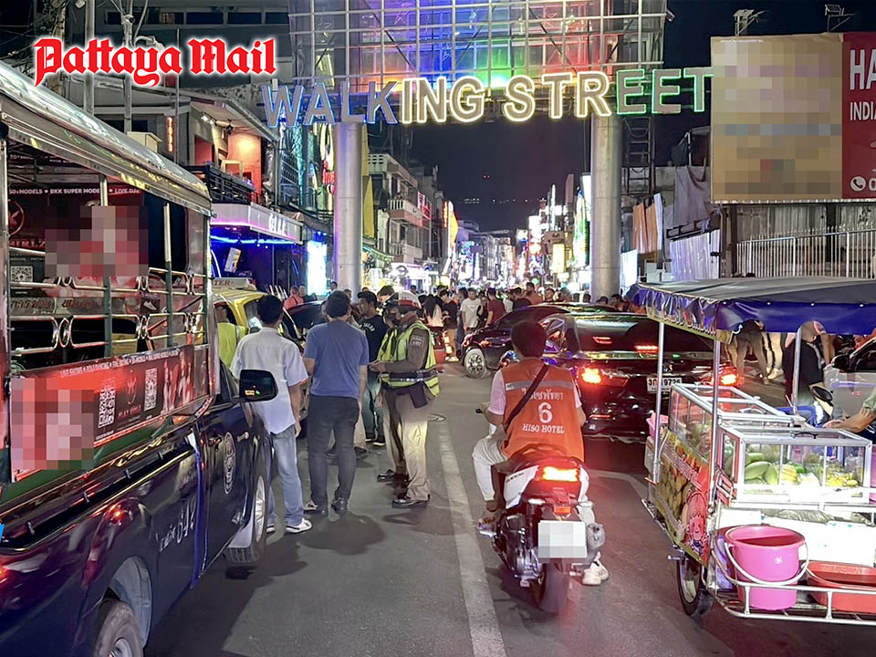 Pattaya’s traffic enforcement faces public scrutiny: is it only effective during big events? (Photo – Double parking baht-buses and side-car vendors get fines for blocking the road at the entrance of Walking Street.)