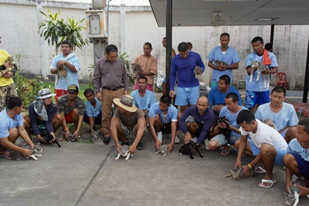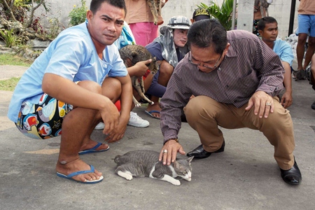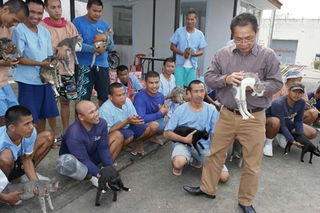 Warden Thanat Hrikanbanchon inspects one of the many cats, as inmates make their case to keep them.