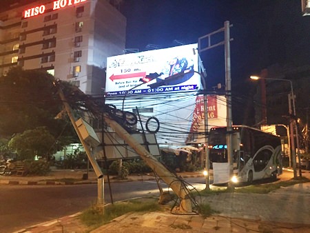 One of Pattaya’s infamous jumbles of power and utility wires finally sagged low enough to cause an accident when a tour bus snagged lines hanging over the Bali Hai Pier flyover, pulling down two utility poles and bringing traffic to a standstill.