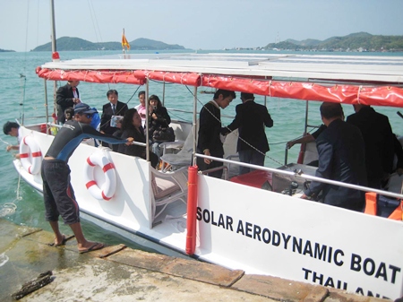 Sen. Niramol Siriwat, chairwoman of the panel, led the Senate contingent to Dongtan Bay where the Yacht Racing Association of Thailand hosted the solar-powered boat trial Jan. 25.