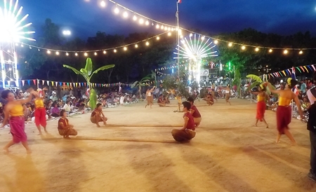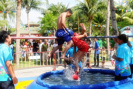 Mayor Itthiphol Kunplome was the master of ceremonies at Lan Po Park in Naklua as locals and tourists gathered for games and sports. Events included slingshot contests, sea boxing, pole-climbing and other activities.