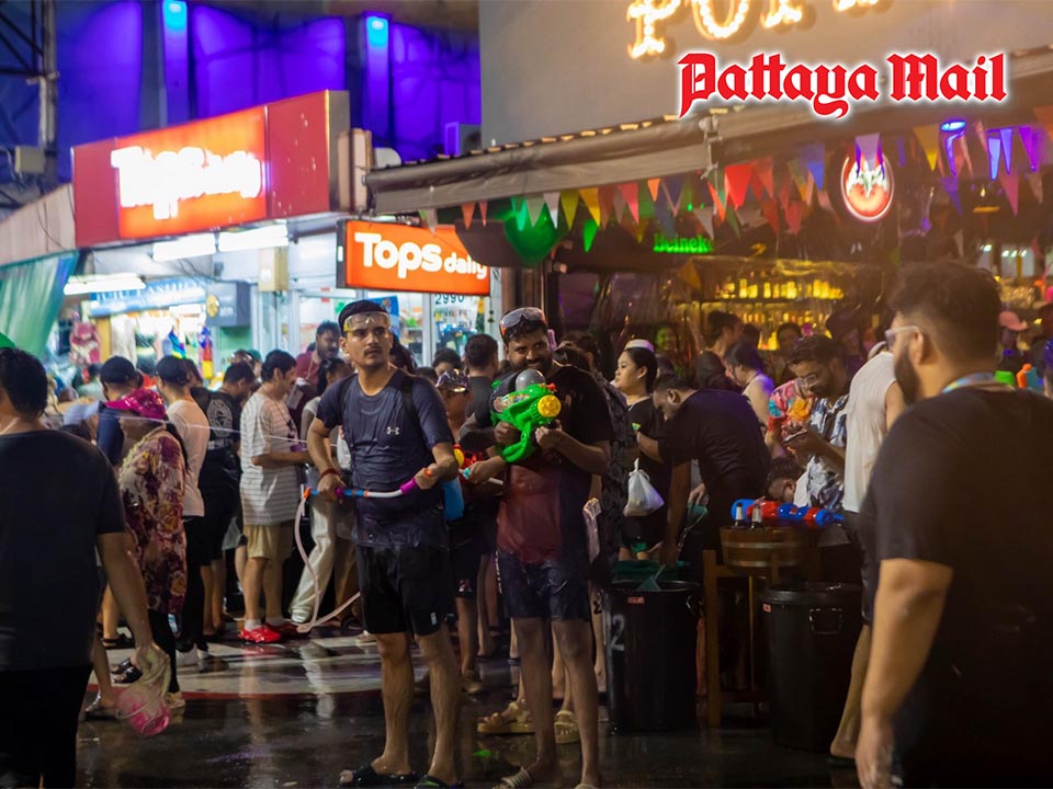 Tourists and locals continued to flood Pattaya Beach Road from central areas near Hard Rock Hotel Pattaya through Soi 7 and Soi 8, with activity intensifying late into the night. Visitors from both Thailand and abroad joined water play activities at beer bars, restaurants, and along the beachfront, creating a lively and densely packed atmosphere.