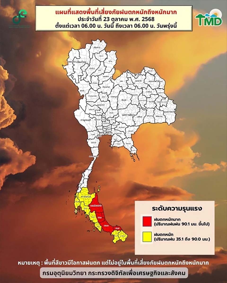 The South will continue to face heavy to very heavy rain, especially in Nakhon Si Thammarat, Phatthalung, Songkhla, and Pattani, due to the monsoon trough and strong northeast monsoon over the Gulf of Thailand. Residents are urged to beware of flash floods, runoff, and waterlogging, while boat operators should proceed cautiously in areas with storms, where waves could exceed 2 meters.