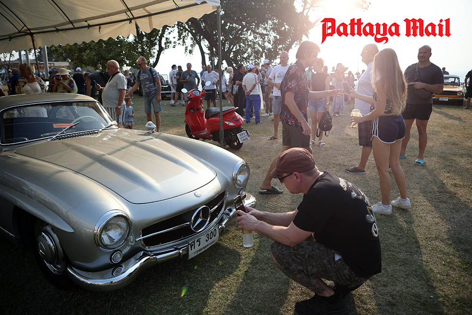 On February 8, the show featured over 65 iconic classic cars, including the Ford Mustang, Chevrolet Corvette, Porsche, Volkswagen Beetle, and Jaguar E-Type. The highlight of the event was the Mercedes Benz 300SL Gullwing from 1955, owned by a member of the Classic Car Friends Pattaya club. This rare vehicle, recognized for its distinctive gullwing doors that open upwards like a bird spreading its wings, is valued at 70 million baht and is one of only eight in Thailand. It is the same model as the royal vehicle used during the reign of King Rama IX, which is now displayed at the Private Car Museum in Suan Sukhothai Palace. Visitors and tourists eagerly took photos with their favorite classic cars while enjoying the romantic sunset atmosphere.