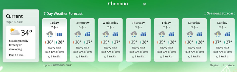 Eastern Region: Thunderstorms in 40% of the area, mostly in Nakhon Nayok, Prachin Buri, Chachoengsao, Chonburi (Pattaya), Rayong, Chanthaburi, and Trat provinces. Minimum temperature 24-27°C, maximum temperature 32-36°C. Southwest wind speed 15-35 km/h. Sea waves 1-2 meters high, over 2 meters in thunderstorm areas.
