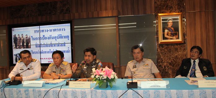 Maj. Gen. Surachet Hakpan, commander of the Royal Thai Police division, chaired a June 6 meeting at Pattaya City Hall with rescue volunteers, scuba diving operators and parasailing, speedboat and jet ski vendors to try and improve accident prevention.