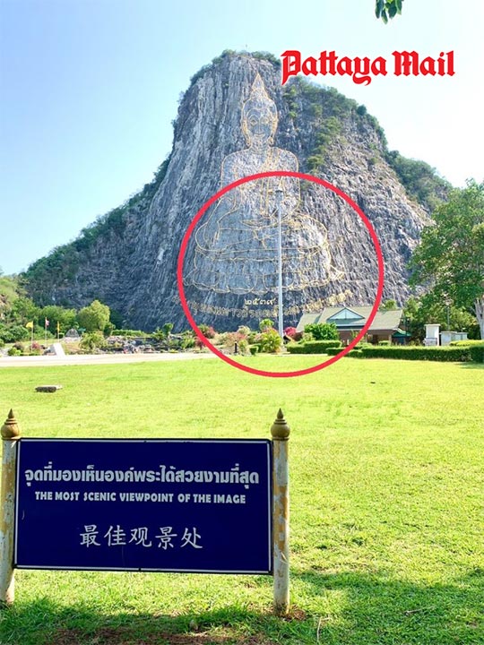 PATTAYA, Thailand – Tourists and residents alike have voiced objections to the placement of a towering streetlight pole, approximately 20-30 meters tall, which obstructs the view of the magnificent Buddha carving on the side of Khao Chi Chan Mountain in Sattahip District.