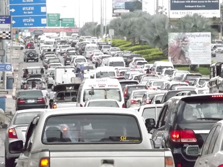 Heavy holiday traffic caused backups in many areas, including North Pattaya Road (shown here).