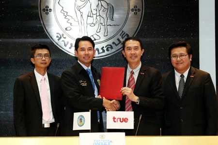 Mayor Itthiphol Kunplome and True Internet Chief Commercial Officer Charoen Limkangwanmongkol signed the agreement at Pattaya City Hall Sept. 18. The 100 million baht Pattaya expansion of True’s existing paid WiFi hotspot network eventually will offer 1,000 access points from Jomtien Beach to Naklua.