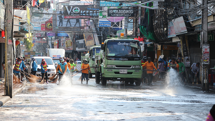 Public Health official Sanya Taptimsri led the team of cleaners to the South Pattaya nightlife strip March 28. A water truck hosed down the street while workers swept away dirt and garbage.