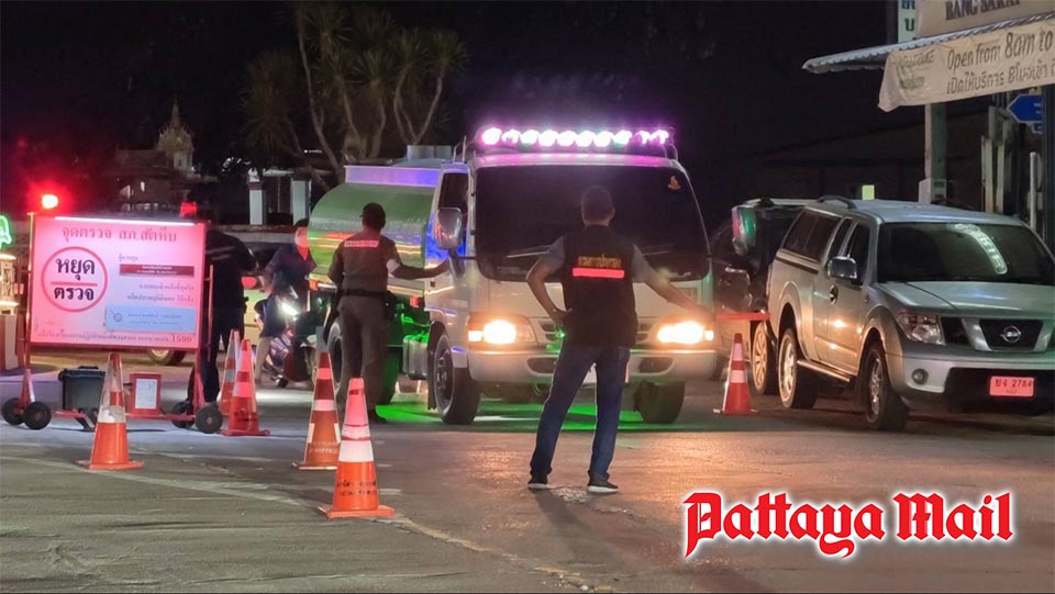 Authorities in Sattahip set up a checkpoint at Bang Saray roundabout as police and local officials step up security measures ahead of upcoming Wan Lai celebrations during Songkran.