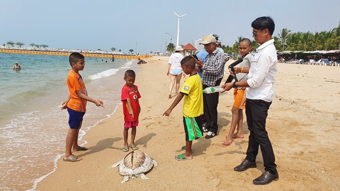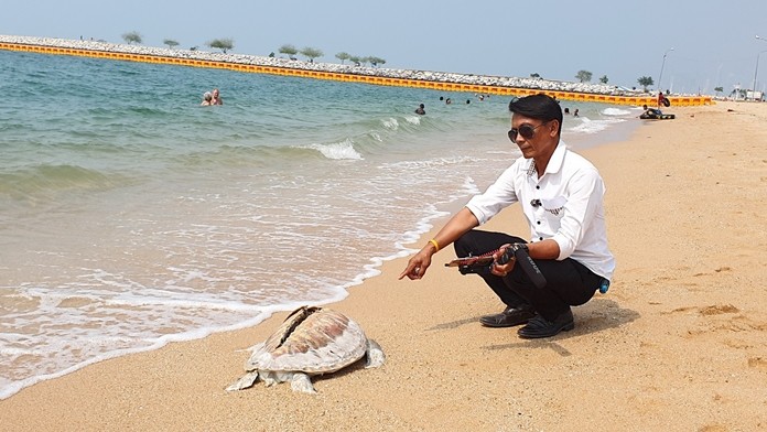 Dr. Kirin Sornrapipatcharoen, veterinarian at the navy’s Sea Turtle Conservation Center, and sailors collected the remains from Somprasong Beach.