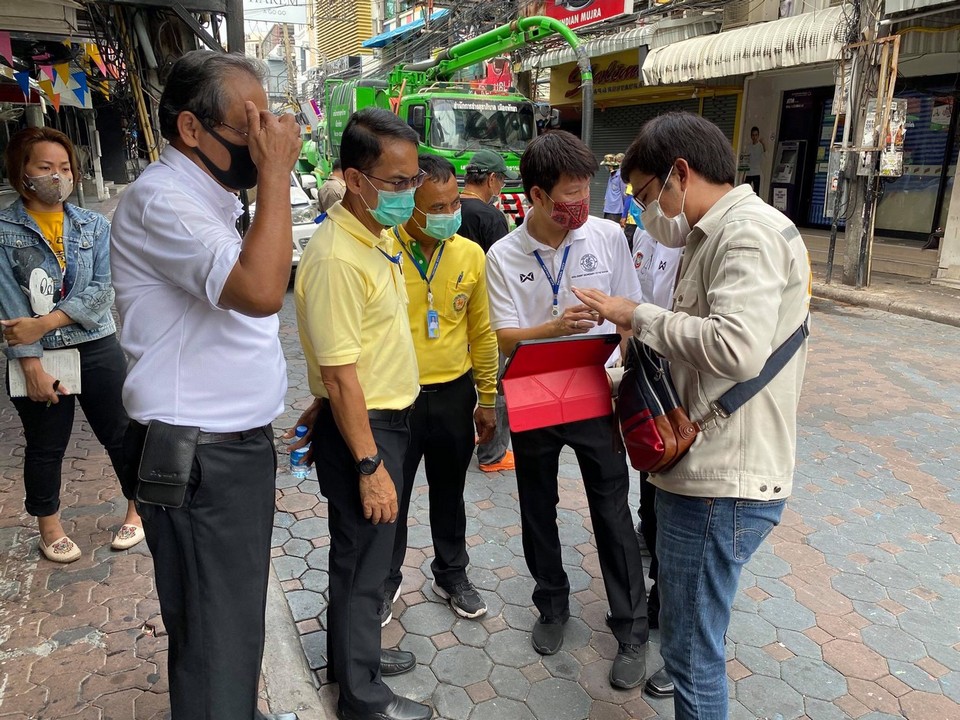 Deputy Mayor Pattana Boonsawad surveyed the roadwork on the shuttered nightlife strip April 27 with city engineers and contractors.