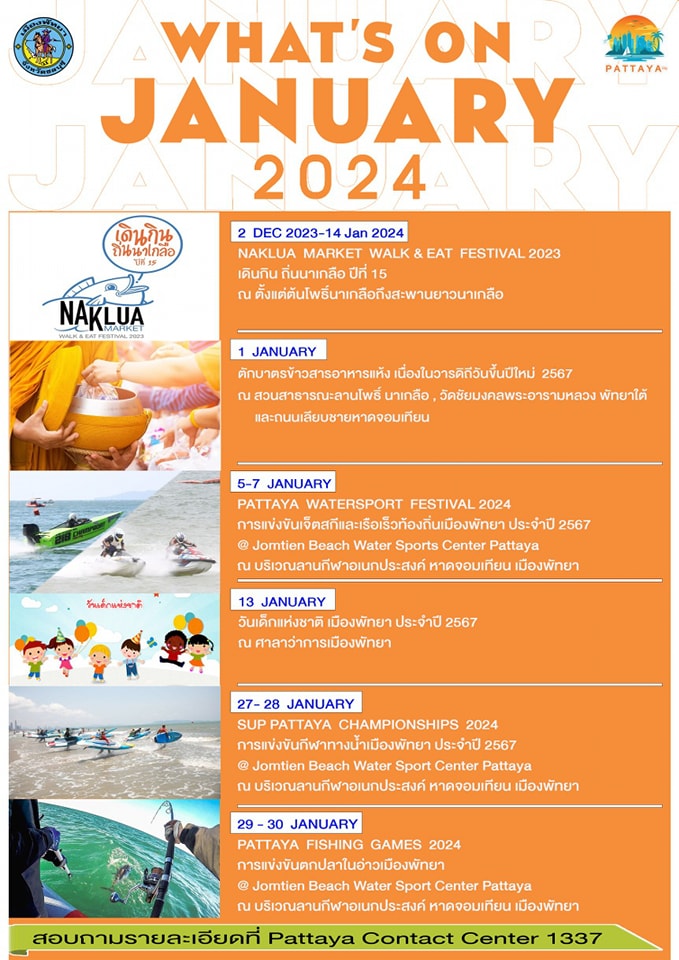 The following weekends, January 6-7 and 13-14, feature the 15th Naklua Market Walk & Eat Festival 2024, a gastronomic delight for food lovers. The festival showcases the local flavors and specialties of Pattaya, as locals and tourists flock to Naklua Market Street to enjoy a variety of dishes and snacks.