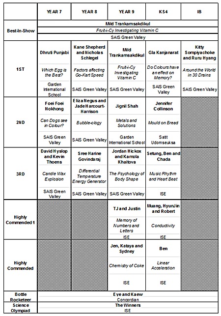 Around 120 students from SAIS Green Valley, SAIS 107, Concordian International School, Satit Udomseuksa School, Garden International School and ISE brought their exhibits and their scientific skills and investigations to be tested and judged against one another. The variety of projects produced by the students was staggering and the judges, from a range of scientific backgrounds, were hard pressed to pick winners in each category.