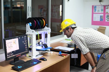 DT teacher Mr Gordon proudly wears his hat as he inspects one of the school’s 3D printers.