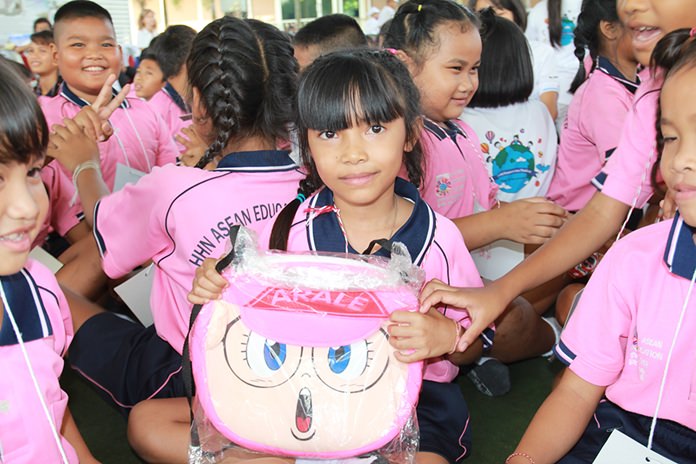 The little ones’ eyes lit up when they saw all those presents on stage at Pattaya City School #8.