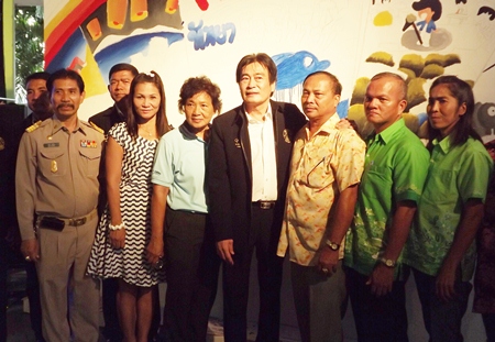 Deputy Mayor Ronakit Ekasingh kicked off the first in a series of “Pattaya White: Come a Little Closer, Can You” campaigns at Pattaya School No. 7’s gymnasium July 8. He and city council members took the lead, painting Pattaya’s dolphin mascot on a white wall in the gym, then inviting 600 students, community leaders, parents and school officials to join in.