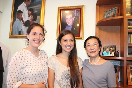 (L to R) Volunteers Alena Hayer and Katharina Hoesler tell Radchada Chomjinda how happy they are to help the foundation.