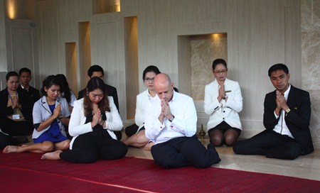 Dominique Ronge (center) GM of the Centara Grand Pratamnak Resort Pattaya, along with Chananchida Wongsa-ard (center, left), Sales and PR manager of the Centara Grand Resort and Spa and other staff take part in the blessing ceremony of the Centara Grand Phratamnak Resort Pattaya.