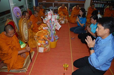 Other top officers and staff at the Jomtien Beach office took part in the merit-making ceremony, following along as the monks chanted and helped in providing the meal for the priests.