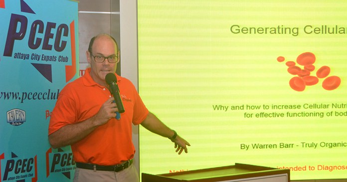 Good nutrition helps generate cellular health was the speakers’ topic at the August 28 meeting of the Pattaya City Expats Club (PCEC). The topic was co-presented by Pascal Deville, Managing Director, Health Food Shop Co. Ltd., and Warren Barr, Managing Director, Truly Organics Co. Ltd.