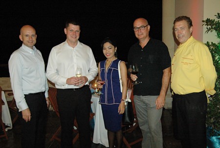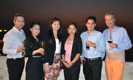 (L to R) George Kenton, Executive Assistant Manager, Rooms, of the Centara Grand Mirage Beach Resort Pattaya; Dominique Ronge, General Manager of the Centara Grand Phratamnak Resort Pattaya; Tony Malhotra, President of Skål Pattaya and East Thailand, Sirilak Khampan, Sales and PR Manager of the Centara Grand Phratamnak Resort Pattaya; Robert John Lohrmann, General Manger of the Centara Grand Mirage Beach Resort Pattaya; and Carl Duggan, EAM F&B at Centara Grand Phratamnak Resort Pattaya.