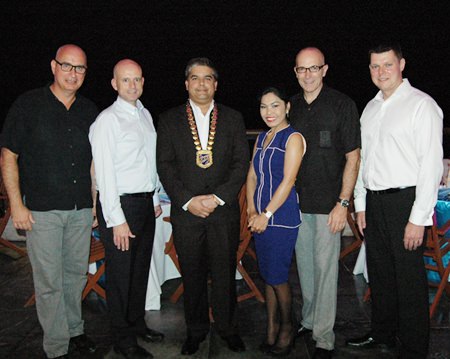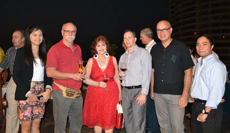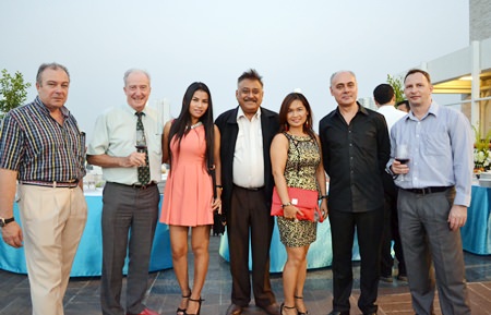 (L to R) Rene E.H. Pisters, GM of the Thai Garden Resort Pattaya; Dr Iain Corness; Nattakarn Sinprasom; Peter Malhotra, Managing Director of the Pattaya Mail Media Group; Ploy Pisters, Luciano Lillus, General Manager of the Sunshine Hotels & Resorts Pattaya; and Danilo Bockert, Deputy General Manager of the Thai Garden Resort Pattaya getting ready for the Skål meeting.