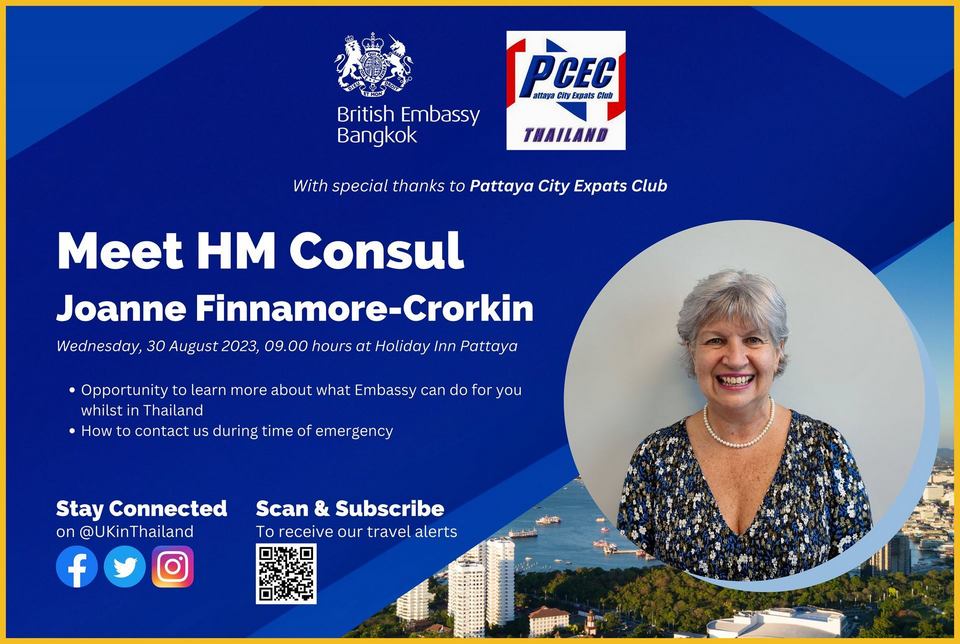 Pattaya City Expat Club (PCEC) is hosting a visit by British Embassy Bangkok consul Joanne Finnamore-Crorkin. She is responsible for the embassy’s consular, welfare work with British nationals throughout Thailand and will speak generally about the services available as well as those unavailable. One particular concern to the embassy at present concerns uninsured British nationals having accidents requiring hospitalization.