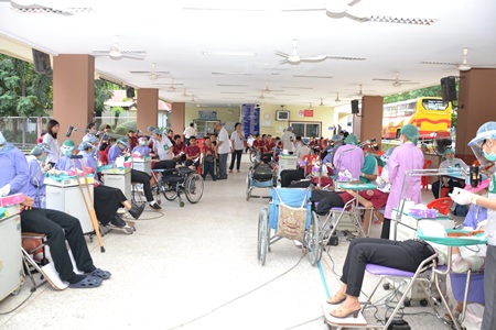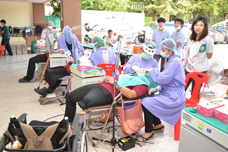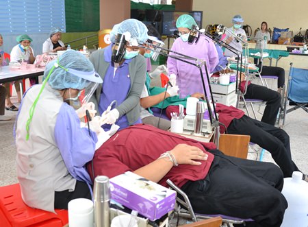 About 30 hospital and Pattaya Public Health Department staffers and PMMV volunteers, led by Dr. Boonchai Wongthaiwan, head of the dentistry department at Banglamung Hospital, examined the students Nov. 18, providing checkups, cleaning and tooth extraction for 120 students.