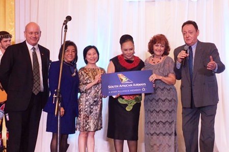 South African Ambassador to Thailand, H.E. Robina P. Marks (3rd right) presents an airline ticket to lucky winner Elfi Seitz (2nd right).