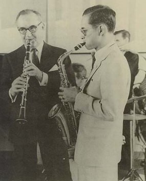 HM King Bhumibol once sat in for a jazz session with the late Benny Goodman, with the photo receiving the title “The Kings of Swing”.