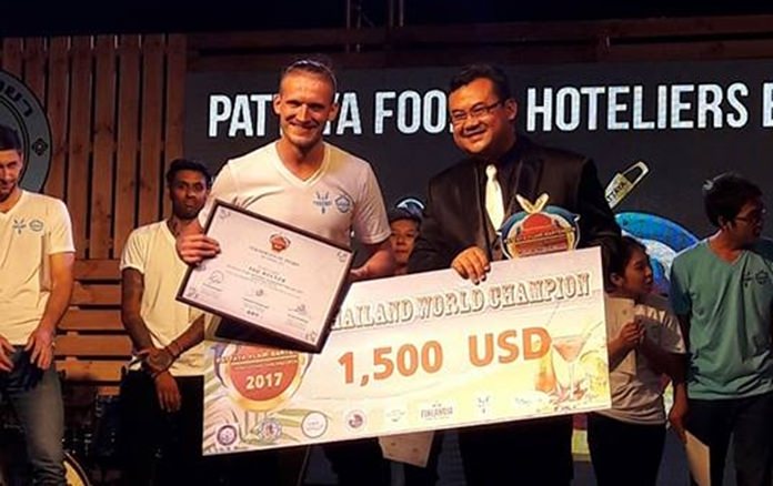 Krit Jiramongkol, president of the Food and Beverage Management Association Eastern Region, presented the 10,000-baht first-place award to Nareerat Madho and Nattapond Julpoon of Silapakorn University at the close of the July 4-6 trade fair at Central Festival Pattaya Beach.