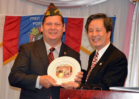 Hans Song, Senior Counselor of the Veteran Affairs Commission (R) presents a gift to Shawn Watson (L), Commander of the VFW Department of Pacific Areas.