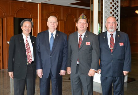 Pattaya Deputy Mayor Ronakit Ekasingh provided the warm welcome before the VFW laid out the agenda for the meeting and introduced the VIPs: Shawn Watson, commander of the VFW Department of Pacific Areas; Homer Kemper, junior vice commander; Jim Malott, supreme representative; Colonel Walton, senior defense counsel; Hans Song, senior counselor; Edward Banas, senior past national commander in chief of the U.S. VFW; Bill Hudson, senior vice commander; and Gerald Kraus, national council member.