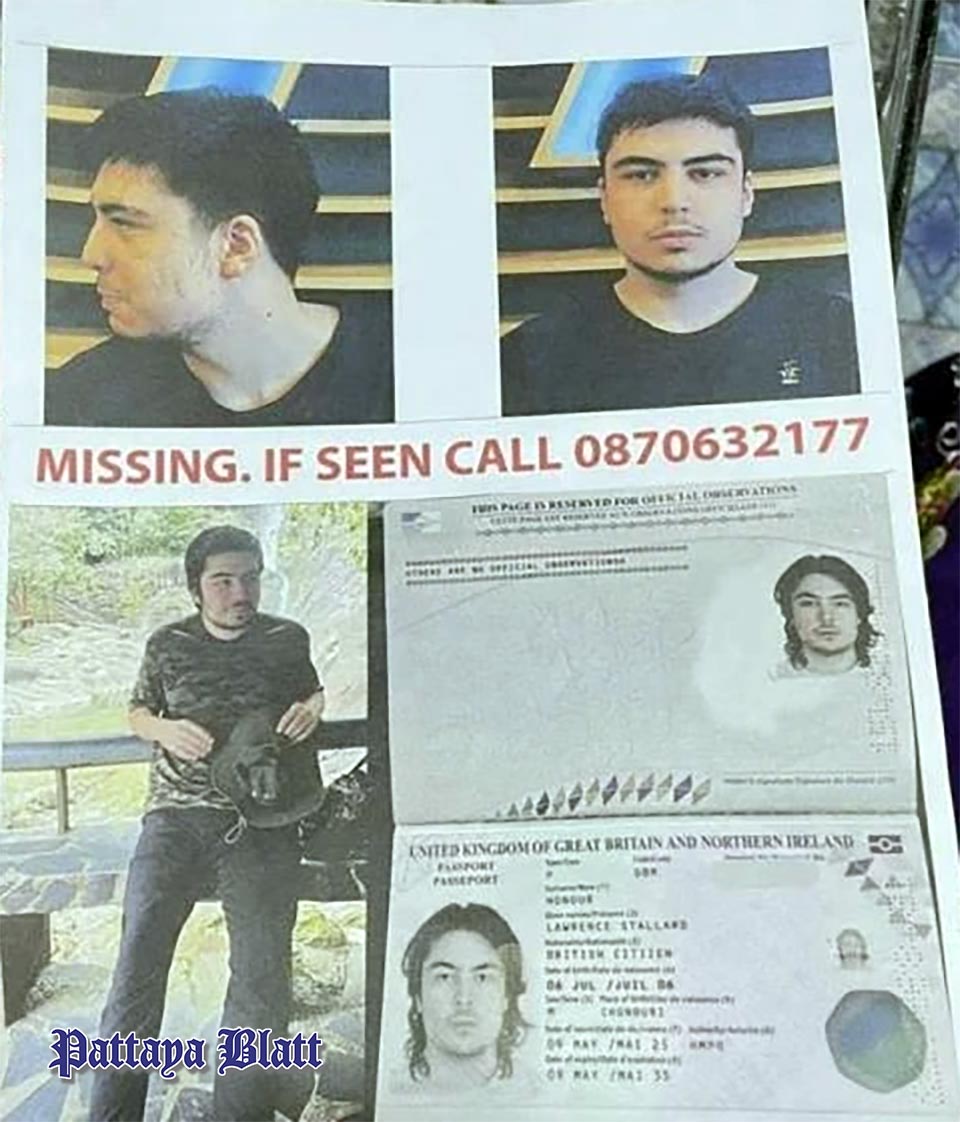 Personen mit Informationen über den vermissten 19-jährigen Brite aus Pattaya werden gebeten, die Polizei Sangkhla Buri unter 0-3459-5300, die Notrufnummer 191 oder direkt seine Mutter unter 087-0632177 zu kontaktieren.