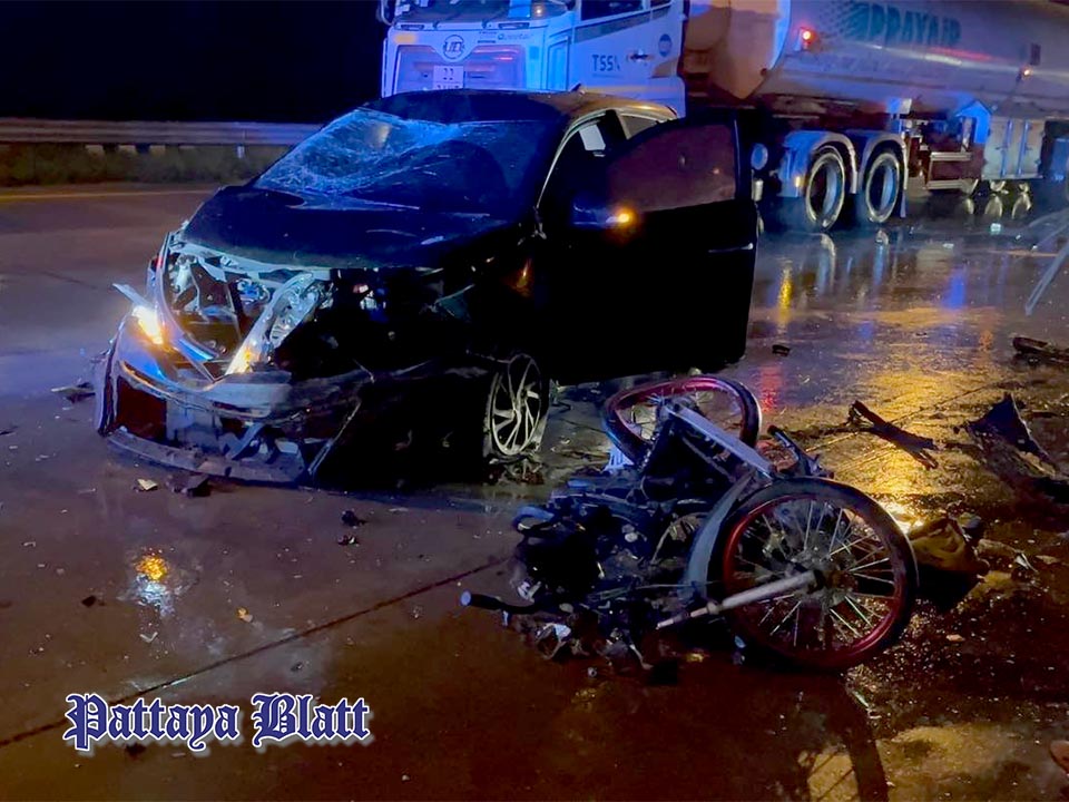 PATTAYA, Thailand – Rettungskräfte erhielten am 7. September um 3:36 Uhr morgens die Meldung über einen Autounfall auf der Autobahn 36 in Richtung Pattaya. Ein schwarzer Toyota Yaris, gelenkt von dem 37-jährigen Natakorn, verlor die Kontrolle und prallte gegen drei Motorräder. Dabei entstand erheblicher Schaden und drei Personen wurden verletzt. Die Rettungsteams leisteten Erste Hilfe vor Ort und brachten die Verletzten anschließend in ein nahegelegenes Krankenhaus.