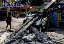 Ein 18-rädriger Lastwagen liegt schwer beschädigt an einer Betonbaustellenbarriere auf der Bang Na–Trat Road in Samut Prakan, nachdem der Fahrer gestanden hatte, eine ganze Flasche Reisalkohol getrunken zu haben. Die Polizei warnt, dass ähnliche Gefahren auch rund um Pattaya bestehen, wo große Fernstraßen Tag und Nacht von Schwerlastverkehr genutzt werden.*