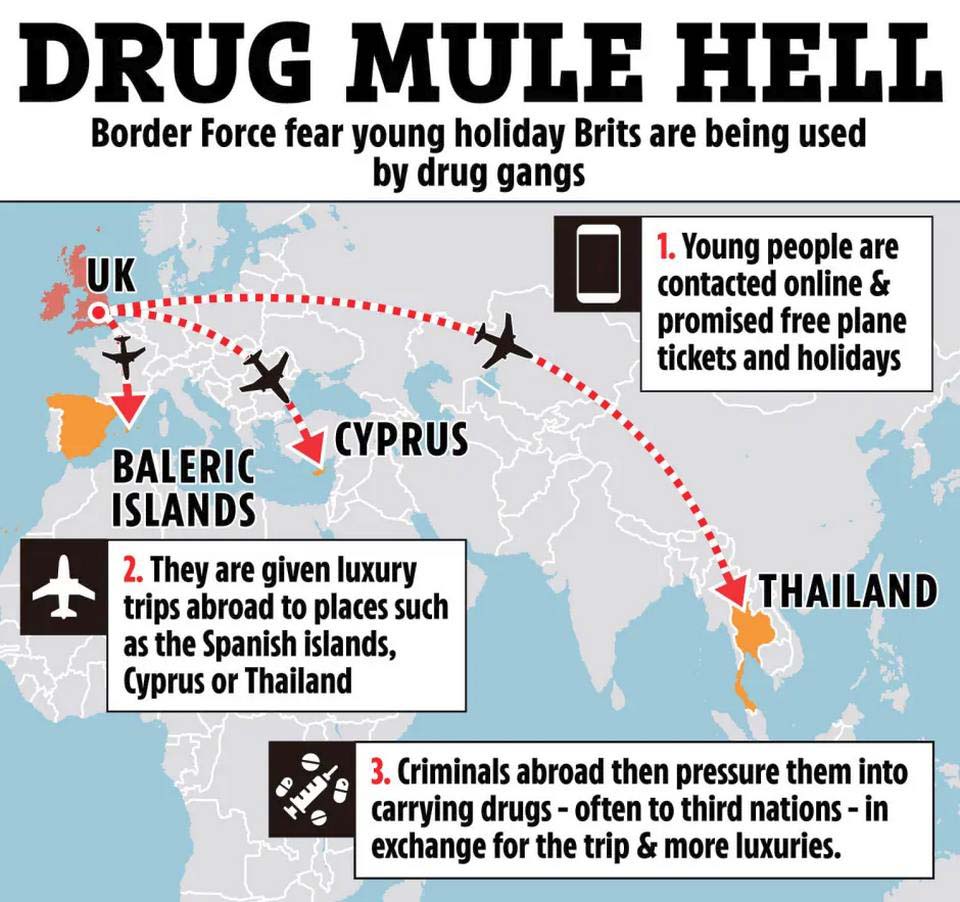 Die britische Tageszeitung The Sun berichtete, dass „baby-faced“ Briten, die ihre erste Auslandsreise antreten, von Grenzbeamten an großen Flughäfen des Vereinigten Königreichs besonders vorsichtig gewarnt werden. In den letzten zwölf Monaten wurden rund 1.000 Briten wegen Drogenvergehen festgenommen, meist wegen des Versuchs, Cannabis nach Großbritannien zu schmuggeln. Die meisten wurden bei der Rückkehr an einem britischen Flughafen entdeckt. Prisoners Abroad schätzt, dass weltweit mindestens 1.800 Briten im Ausland inhaftiert sind, überwiegend wegen Drogendelikten.