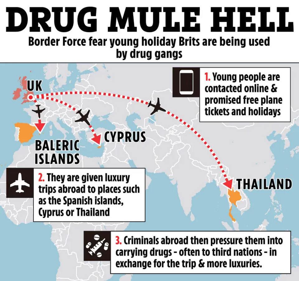 Die britische Tageszeitung The Sun berichtete, dass „baby-faced“ Briten, die ihre erste Auslandsreise antreten, von Beamten der Grenzbehörde an den wichtigsten Flughäfen Großbritanniens zur besonderen Vorsicht ermahnt werden. Im vergangenen Jahr wurden rund 1.000 Briten wegen Drogenvergehen festgenommen, meist beim Versuch, Cannabis nach Großbritannien einzuschmuggeln. Die meisten wurden bei der Rückkehr an einem britischen Flughafen ertappt. Laut Prisoners Abroad befinden sich weltweit mindestens 1.800 Briten im Ausland in Haft, überwiegend wegen Drogenvergehen.