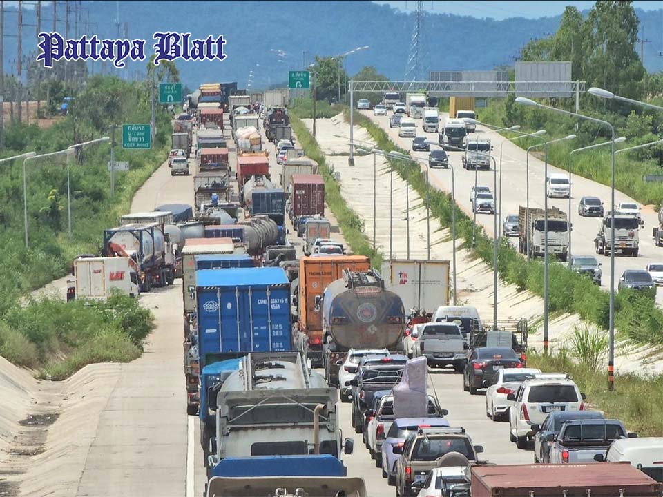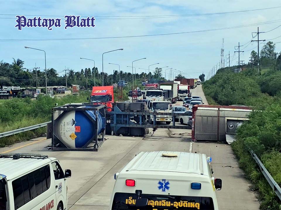 PATTAYA, Thailand – Ein möglicher Chemieunfall konnte am frühen Morgen des 4. Juli 2025 nur knapp verhindert werden, als ein 18-rädriger Tanklastwagen auf der Highway 36 nahe dem Eingang zum Wat Ban Khlong Yai im Unterbezirk Pong, Bezirk Banglamung, umkippte. Der Unfall ereignete sich auf der stadtauswärts führenden Fahrbahn in Richtung Rayong und verursachte einen fast zehn Kilometer langen Rückstau.