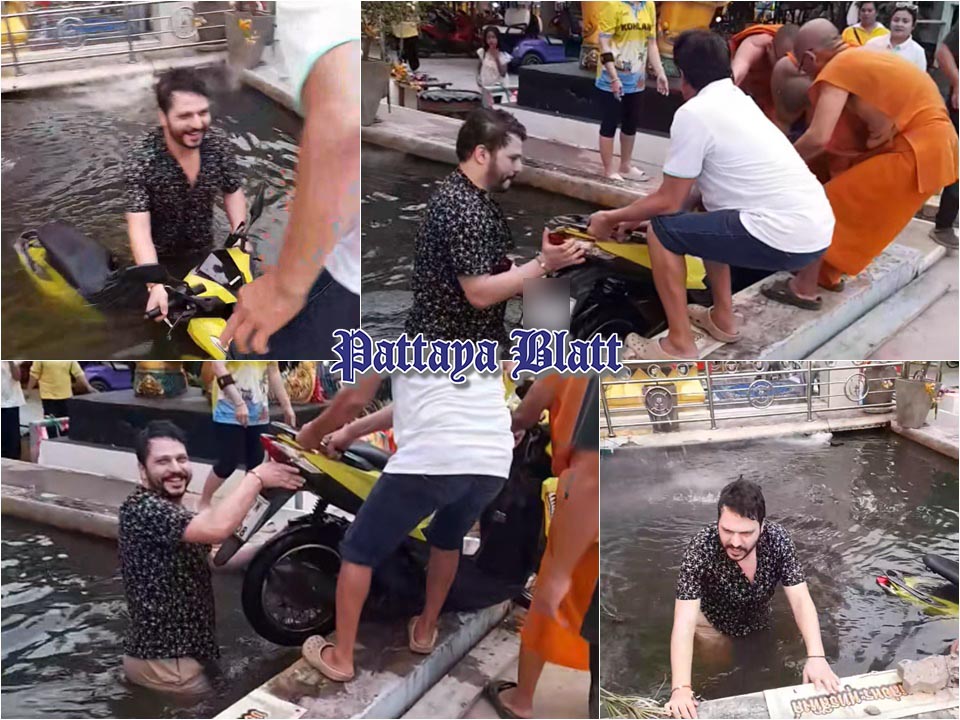 PATTAYA, Thailand – Ein zugleich urkomisches und schockierendes Video sorgt derzeit auf thailändischen Social-Media-Plattformen für Furore: Es zeigt, wie ein ausländischer Mann mit seinem Motorrad direkt in einen heiligen Teich fährt – und das ausgerechnet vor der Statue des verehrten Luang Po Thuat im Tempel von Koh Larn. Mönche und Dorfbewohner eilten sofort herbei, um zu helfen.