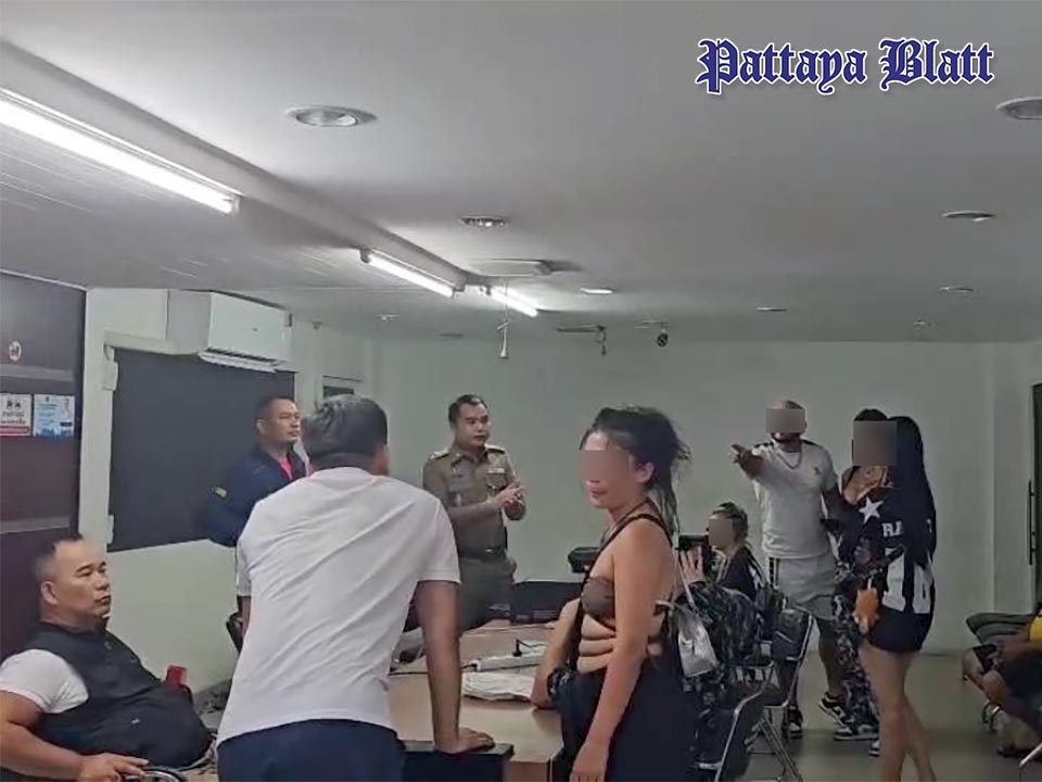 Spannungen auf der Polizeistation Pattaya – streitende Touristen werden getrennt, um weitere Konflikte zu verhindern.