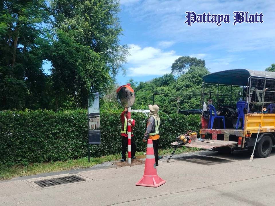 PATTAYA, Thailand – Ein kleines Detail mit großer Wirkung: In Pattaya wurden an mehreren gefährlichen Straßenabschnitten neue konvexe Verkehrsspiegel installiert – darunter auch an einer berüchtigten Kurve in der Sukhumvit Pattaya Soi 19/5. Nachdem Anwohner auf die mangelnde Sicht hingewiesen hatten, reagierte das Rathaus zügig: Das Amt für Verkehrsplanung und Transport ließ kurzerhand einen Spiegel anbringen, der die Sichtverhältnisse an der Kurve deutlich verbessert.