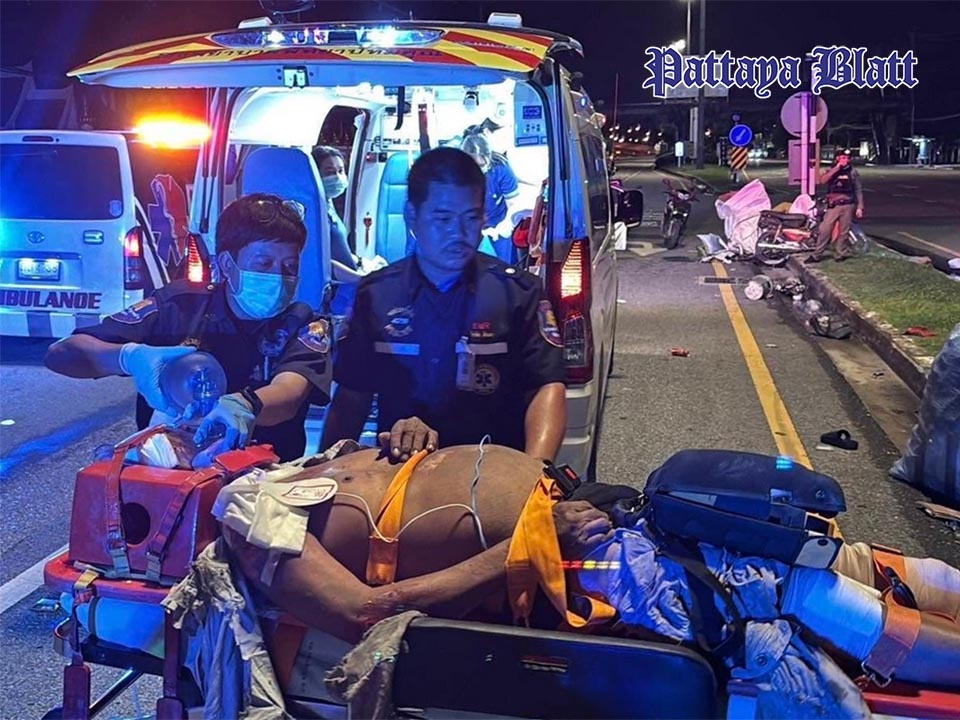 Am frühen Morgen des 6. Juli, kurz nach 3:00 Uhr, kam es auf der Sukhumvit Road nahe Wat Jittabhawan im Stadtteil Naklua zu einem schweren Unfall: Ein weißer Honda Civic prallte mit voller Wucht gegen ein umgebautes Beiwagen-Motorrad, das ein älterer Mann zum Sammeln von Recyclingmaterialien nutzte. Der Aufprall war verheerend – der Wagen des Mannes wurde zerstört, Plastikflaschen flogen über die Straße, und das Opfer, schätzungsweise in den 50ern oder 60ern, blieb bewusstlos und schwer verletzt auf der Fahrbahn liegen.